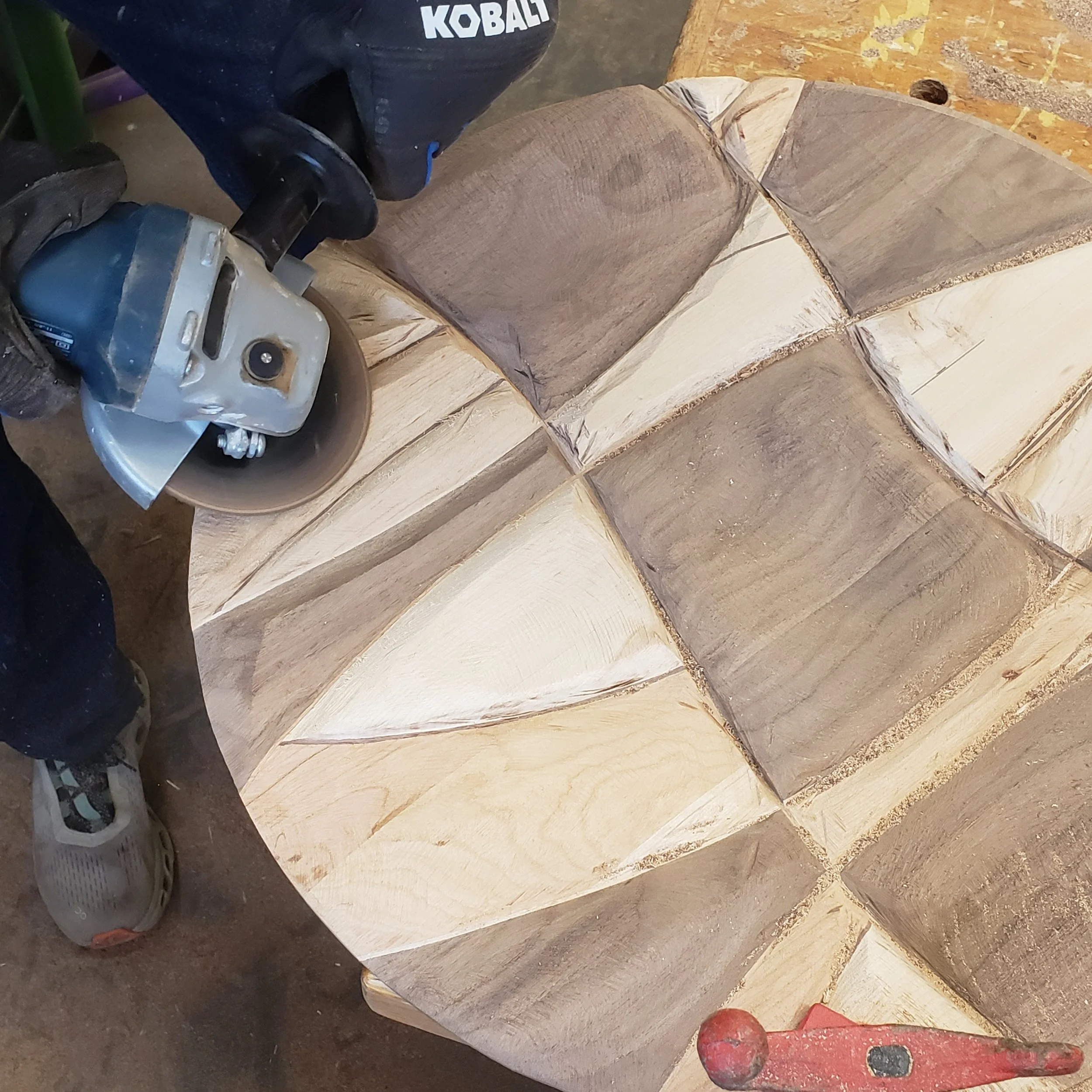 Once the panel is fully assembled and the glue has cured, I carve the sculpture using an angle grinder fitted with a carving disc. This is where the piece really begins to come alive. I have a master plan, but work intuitively, following the contours of the wood and refining the curves with sweeping motions. This is a Zen-focused time. An errant grind can ruin a piece, and a moment of inattention with the exposed, spinning cutting wheel could sideline me for a while. As the layers of wood are carved away, the sculpture gains depth and movement—subtle transitions between the different hardwoods emerge, hopefully highlighting the flow and rhythm I envisioned from the beginning.